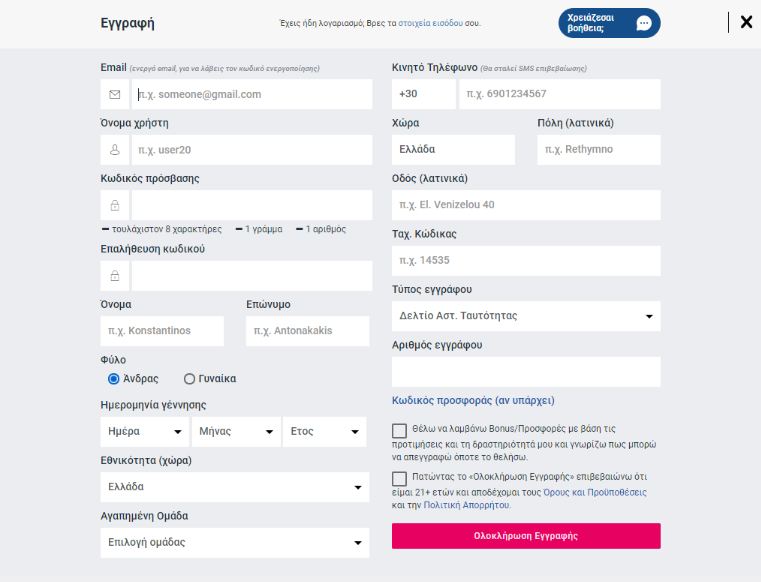 Τέλος, πρέπει να συμπληρώσετε τη διεύθυνση σας με λατινικούς χαρακτήρες αλλά και το αριθμό της Αστυνομικής σας ταυτότητας ή του διαβατηρίου σας. Για οποιοδήποτε πρόβλημα ή περαιτέρω δυσκολία μπορείτε να κάνετε κλικ στο “χρειάζεστε βοήθεια” επικοινωνώντας με το τμήμα εξυπηρέτησης για να σας βοηθήσουν άμεσα. Μόλις το συμπληρώσετε απλά πατήστε “Ολοκλήρωση Εγγραφής”!