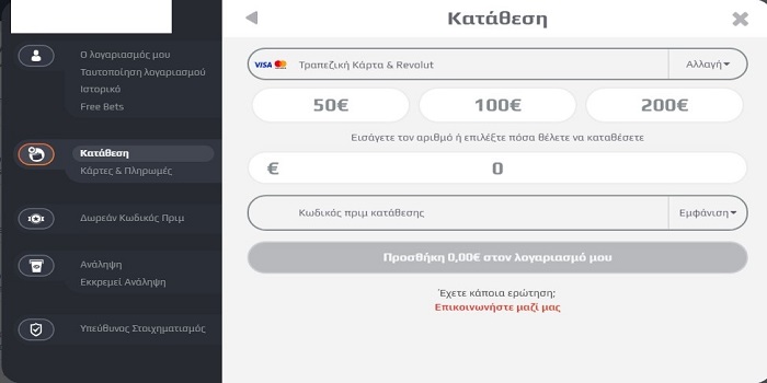 Βήμα 4: Στο παράθυρο με τα στοιχεία του λογαριασμού σου, θα πας στο πεδίο «Κατάθεση», μιας και στο Live Casino τα promo codes διατίθενται μόνο με την προϋπόθεση κατάθεσης.